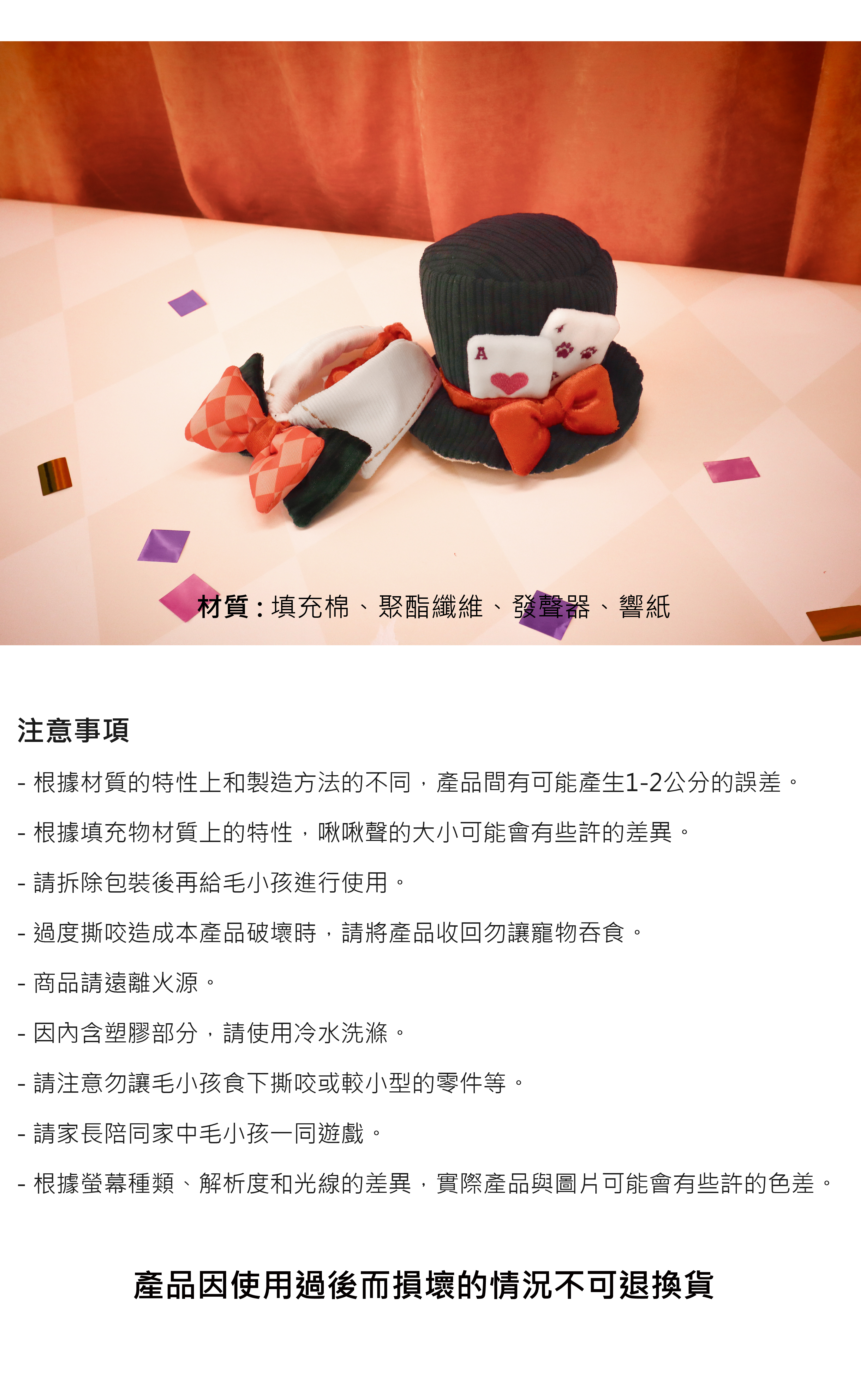 | 材質 | 填充棉、聚酯纖維、發聲器、響紙 |